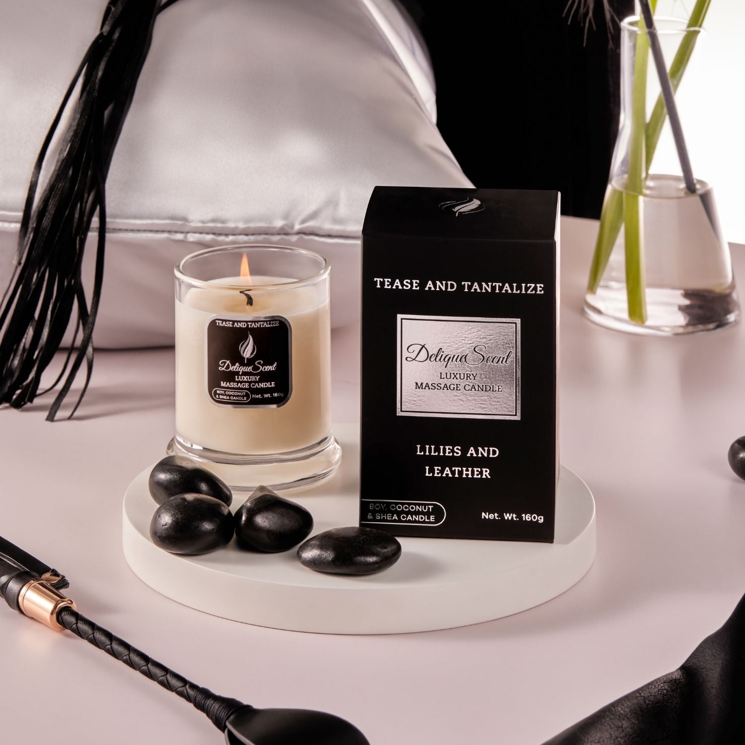 Venture into the BDSM world of playful seduction with our "Tease and Tantalise" Massage Candle, where anticipation meets indulgence in a symphony of sensory and visionary delight. Infused with an irresistible blend of Exotic Lilies and Leather, the warmth of this candle, and the scent of leather, sets the stage for an unforgettable experience.